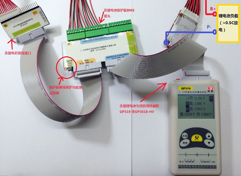 在电池平衡修复好后,可利用三端接口板,做下大电流放电测试,同步看下在放电时电芯电压的情况。
