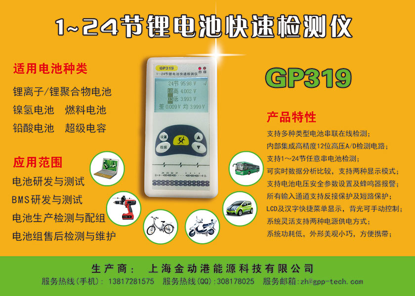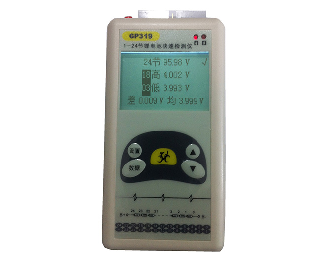 GP319为手持式电池快速检测仪,可同时快速检测多达24节电池的电压情况并自动对电压进行分析比较,精度高,时效性强,显示清晰,具有操作简单,实用可靠,方便携带,性能价格比高的特点。