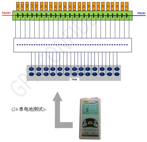 GP19可测试1~24串的锂电池包, 对于串数少于24串的电池,已B-(黑色线)为对准,多出来的测试针悬空即可。