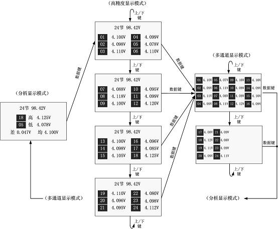 (与保护板连接图) (断开保护板,设备的测试接头连在电芯线端) (按“数据”键,可看到不同显示模式)