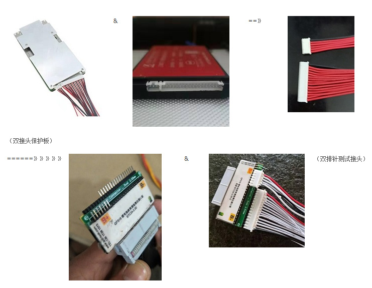 目前一些高串数保护板有使用双测试接头,比如20串的保护板,使用18Pin + 3Pin的连接 或 15Pin +6Pin等(如下图),由于2个接头之间的间距大,无法使用设备标配的单排测试接头,客户可使用双排针测试接头(BTC24-2.00-D 或 BTC24-2.54-D), 备注: 双排针测试接头非标配件, 需额外采购。使用双排针测试接头时,不可插错插反!!
