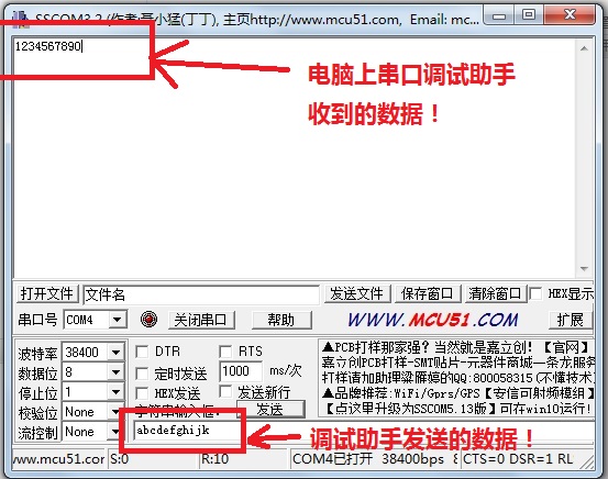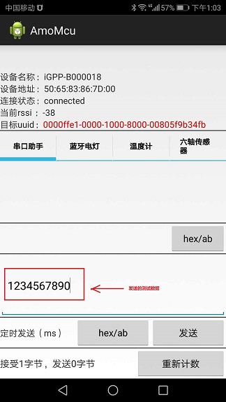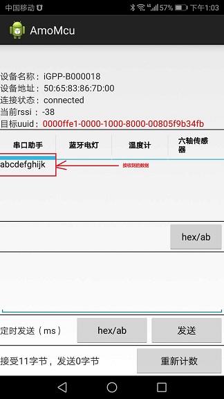 下面是利用 AMOMCu的蓝牙测试软件 和 串口调试助手的接收/发送界面: